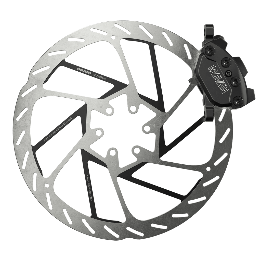 The SRAM Maven Silver 4-Piston Disc Brakes (DB-MVN-SLV-B1) completely reset the benchmark for absolute stopping force. Delivering roughly 50% more power than the legendary Code platform, it transforms raw strength into uncompromising control on the most demanding enduro and downhill terrain. That control begins at the lever, where a refined SwingLink architecture to deliver a smooth, progressive bite that drastically reduces arm pump and hand fatigue. At the wheel, the incredibly stiff 4-bolt caliper acts as a massive thermal heat sink. This superior heat management ensures your brake feel remains absolutely consistent, meaning the final corner of a massive descent feels exactly like the first. Because this baseline power is so exceptionally high, you have unprecedented freedom to tune your exact ride feel simply by downsizing rotors or swapping XL pad compounds. For riders seeking workhorse reliability, the Maven Bronze tier packages this gravity-defying architecture in a sleek, black anodized finish, complete with tool-free Reach Adjust for instant ergonomic customization.